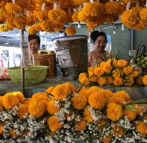 Dort saß eine Thai und verkaufte Kratongs, die hübschen handgefertigten Blumengebinde, die zu Wasser gelassen werden. Ich fragte sie, ob sie diese selbst gefertigt hätte, doch sie sagte, dass sie das Werk der Frauen auf der anderen Seite der Brücke wären und wir gerne den « Floristinnen »