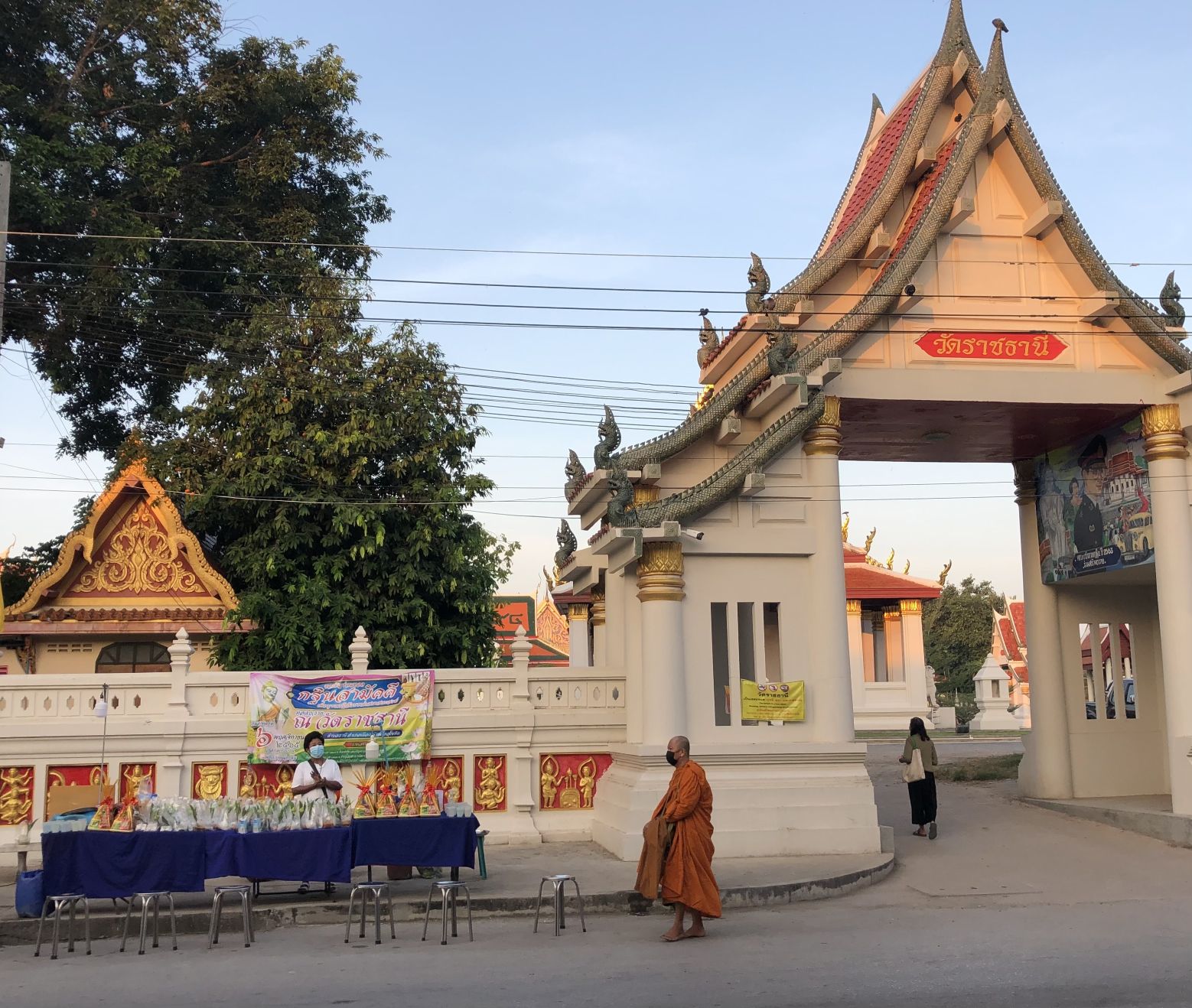 Über seinem orangen gewickelten Gewand trug er eine Almosenschale, ein braunes oder silbernes großes topfähnliches Behältnis mit Deckel und Tragegurt. Die Besitzer der Marktstände steckten den Mönchen entweder Geldnoten oder Essen in diese Behältnisse und die Mönche dankten ihnen im Gegenzug damit, dass sie für sie ein Gebet sprachen. Es gab mit Blumenknospen und Geldscheinen dekorierte Stäbe zu kaufen, die man ebenfalls den Mönchen als Gabe schenken konnte. Wir verließen die Markthalle und gingen zum Tempel. Vor dem Eingang waren mehrere Stände aufgebaut, an denen man für 20 Baht (ca. 50 Cent) eine Plastiktüte mit Reis, Wasser und einer Lotusblüte oder für 50 Baht ein Rundum-Sorglos Paket mit einer Rolle Toilettenpapier, Kaffeepulver, einer Flasche Wasser und einem Snack für die Mönche kaufen konnte. Die Käufer überreichten den Mönchen ihr Geschenk, nahmen eine kleine Plastikschüssel und einen Becher Wasser zur Hand, knieten vor ihnen auf der Straße oder dem Bürgersteig nieder und gossen langsam das Wasser aus dem Becher in die Schüssel, während der Mönch das Gebet sprach.