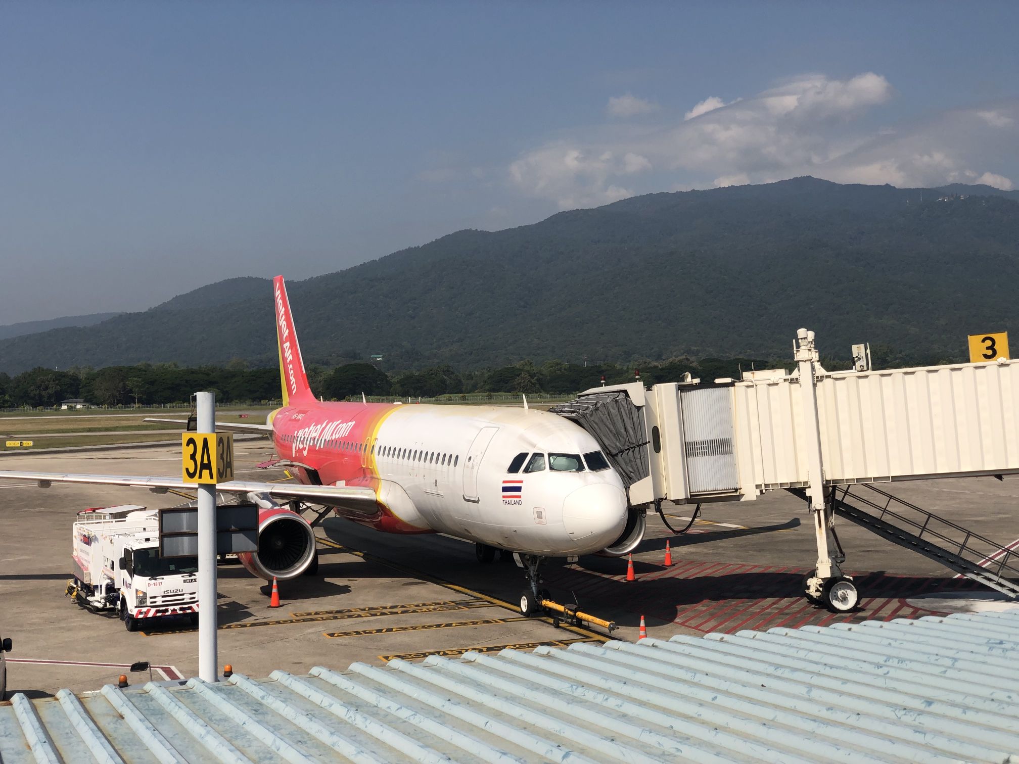 Sie war wirklich daran interessiert, dass wir uns bei ihr wie Zuhause fühlten. Heute hatte sie bereits um 5 Uhr morgens in der Küche gewirbelt und so kamen wir in den Genuss eines besonderen Frühstücksbuffets. Im stilvoll eingerichteten kleinen Speiseraum warteten neben einem typischen thailändischen Warmgericht aus Reisnudeln, Omelett, Spiegeleier, Würstchen, Salat und Rohkost, frische Ananas, Melone und kleine thailändische Desserts wie sticky Reis mit Banane sowie ein Sojabohnen-Nachtisch auf unsere Gaumen. Alles war mundgerecht und optisch sehr ansprechend angerichtet und ich probierte alle thailändischen Speisen. Nach dem Frühstück organisierte uns Khun Lek einen Fahrer zum 4 km entfernt gelegenen Flughafen. Innerhalb von 10 Minuten erreichten wir diesen. Da wir gestern Abend schon online für unseren Thai Vietjet Air Flug nach Phuket eingecheckt hatten, mussten wir lediglich die Rucksäcke aufgeben. Dies war schnell erledigt. Im Gatebereich sah man, dass die Passagiere dieses Fluges überwiegend Europäer waren. Während Harald beim online checkin einen Gangplatz neben einem rumänischen Paar zugewiesen bekommen hatte, saß ich am Fenster neben einem jungen Paar aus Houston/Texas. Wir durchflogen mehrfach Turbulenzen. Im Landeanflug konnte ich unter uns und den Wolken die vielen kleinen grünen Inseln in der Andamanensee