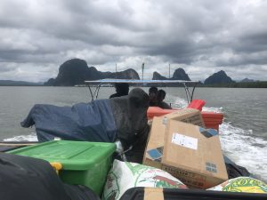 In einem kleinen Restaurant aßen wir zu Mittag, für den gegrillten Fisch reichte allerdings die Zeit nicht mehr, da wir bereits um 13.20 h auf die « Fähre » nach Ko Yao Noi zusteigen mussten, die nur einmal täglich hier vorbei kommt. Zwischen all den Touristenbooten, die anlandeten erschien dann unsere « Ferry ». Sie glich eher einem Seelenverkäufer😂. Jede Menge Kisten und Boxen waren auf dem Vordeck geladen. Wir gingen an Bord und setzten uns zu den 7 Mitreisenden in den recht dunklen Schiffsinnenraum, doch nach wenigen Minuten suchte ich mir einen Platz auf der Treppe zwischen all den abgedeckten Waren. Harald leistete mir bald Gesellschaft. So verging die Fahrt doch angenehmer an der frischen Luft und mit der herrlichen Aussicht auf die umliegende grüne Karstlandschaft.
