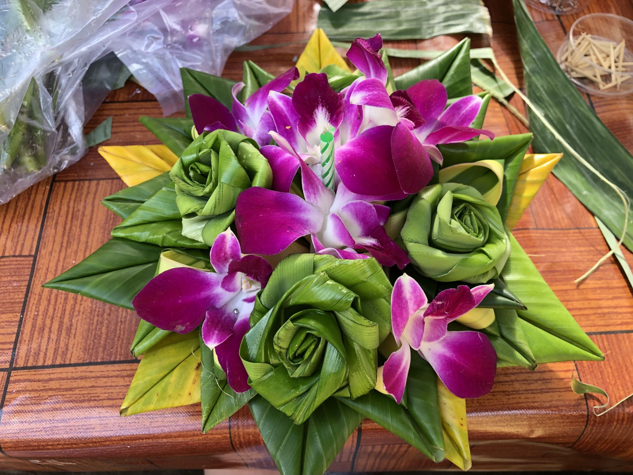 zuschauen könnten. Gesagt, getan, eine der Thai Frauen sprach sehr gut englisch und lud mich direkt zur Bastelstunde ein😂. Schon saß ich neben ihnen, bekam Blätter der Bananenstaude in die Hand gedrückt und genaue Faltanweisungen. Nach kurzer Zeit hatte ich die Technik verinnerlicht.