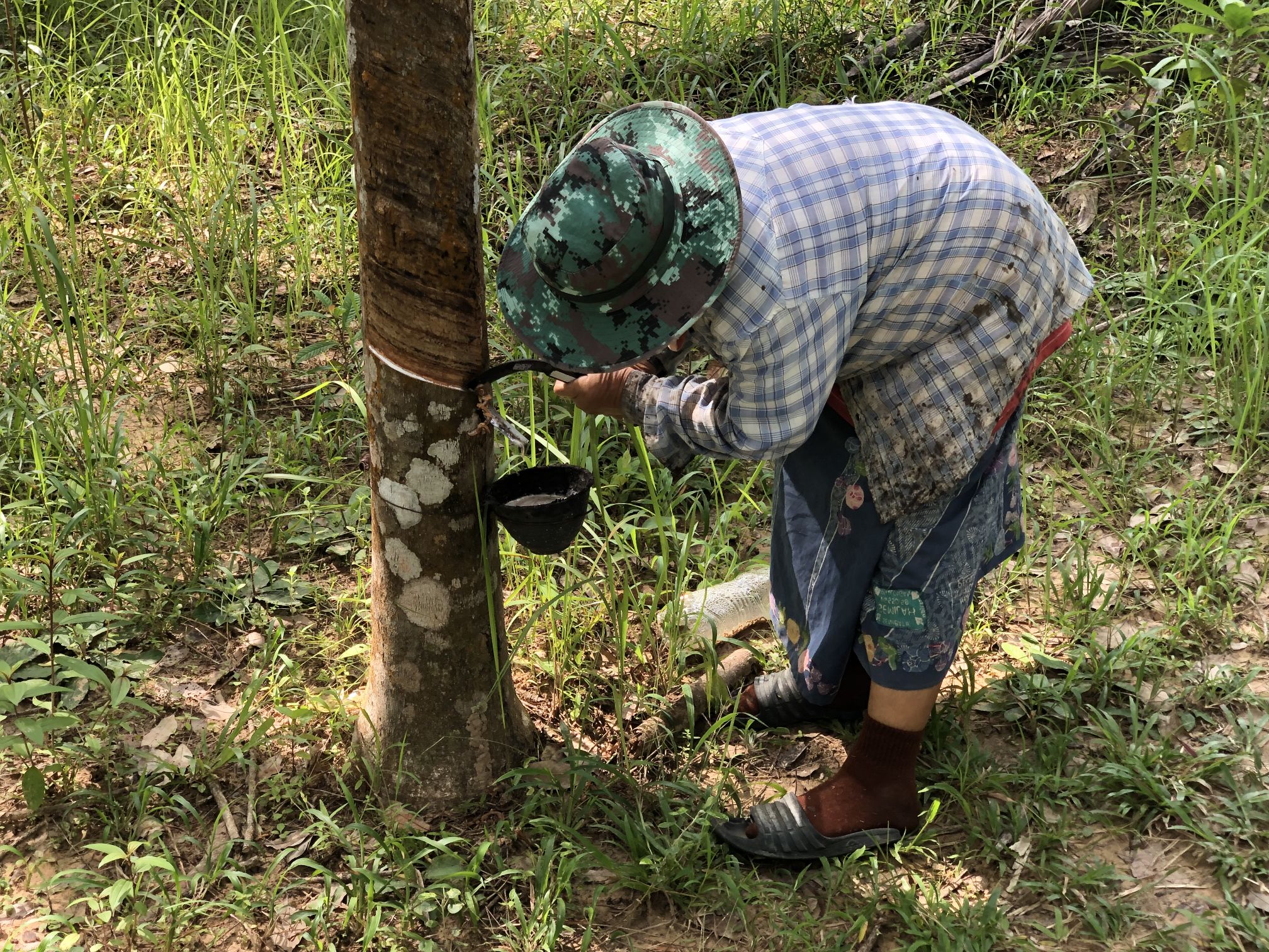 und wie heißt es so schön: Reisen bildet! Wir wissen nun, dass die Kautschukfarmer in der Nacht oder am frühen Morgen in die Kautschukplantagen gehen und die Baumrinde mit einem scharfen Messer so einritzen, dass der Baumsaft austreten kann und nach unten läuft. Der Baumsaft ist eine milchig aussehende Flüssigkeit, die nach Toilette stinkt🤣. In den eingeritzten Rinnsalen läuft der milchige Latexsaft in am Baum mit Draht festgemachte Kokosnussschalen. Nur in der Nacht fließt der Baumsaft aus dem Kautschukbaum und das auch nur bis zu 3 Stunden lang. Am Tag fließt der Saft nicht, da es zu heiß ist.Der Latexmilchsaft wird anschließend eingesammelt und die Schalen geleert. Zuhause angekommen,