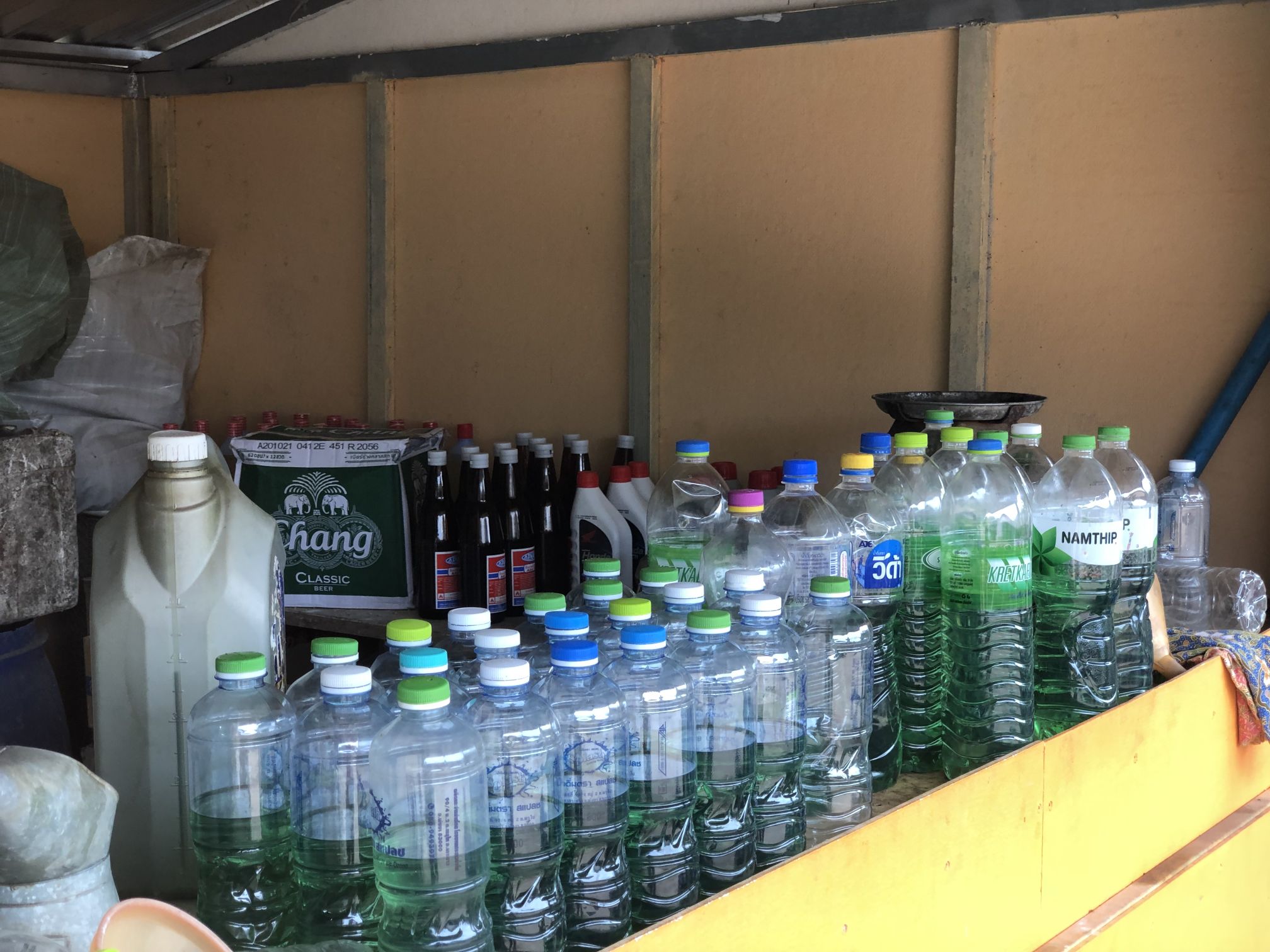 Harald wandte ein, dass die sicherlich alle nachts zum Fischfang auf dem Meer unterwegs waren und sich deshalb nun ruhen müssten- das mag für Einzelne vielleicht zugetroffen haben😉.Immerhin fiel mir dann doch noch ein arbeitender Mann ins Auge, der gerade dabei war, neue Reusen zu bauen. Im Hafen ankerten farbenfrohe « Fischkutter ». Oberhalb des Hafens lag in exponierter Lage ein Restaurant, von dem aus man einen schönen Blick über das Dorf und die Bucht hatte. Außer den ärmlichen Behausungen der Fischer gab es lediglich eine kleine Moschee, einen noch kleineren Laden und eine super spezielle « Tankstelle ». Harald ließ sich von der Ladenbesitzerin, die auch gleichzeitig die Tankstelle bediente, 2 Liter Sprit aus alten PET Flaschen einfüllen.