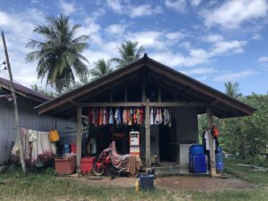 Noch einmal steuerten wir den Süden an, um uns ein kleines Fischerdorf anzuschauen. Die Insel ist insgesamt recht dünn besiedelt. Es gibt nur wenige Ortschaften, aber viele freistehende Häuser entlang der Straßen oder Kautschukwälder. Die meisten stehen zum Schutz vor den extremen Regenfällen im Herbst auf Stelzen. Manche wirken klein und baufällig, andere sind geräumiger und gepflegter. Mit Farbe wird versucht, alles ein wenig aufzuhübschen, mal gibt es ein türkis getünchtes Geländer, mal ein blau oder grün eingedecktes Dach, eine orange oder rosa gestrichene Fassade oder ein farbiges Blechdach. Im Fischerdorf jedoch ging es sehr ärmlich zu. Die Bretterbuden sahen aus, als würden sie beim nächsten heftigen Sturm restlos in sich zusammenfallen. Doch wie so oft strahlten die Menschen trotz dieser ärmlichen Behausungen eine Grundzufriedenheit aus. Alle grüßten uns freundlich. Die Frauen waren in und um die Häuser beschäftigt, fegten und knüpften Netze, die Männer lagen fast ausnahmslos daddelnd in den Hängematten auf der « Veranda ».