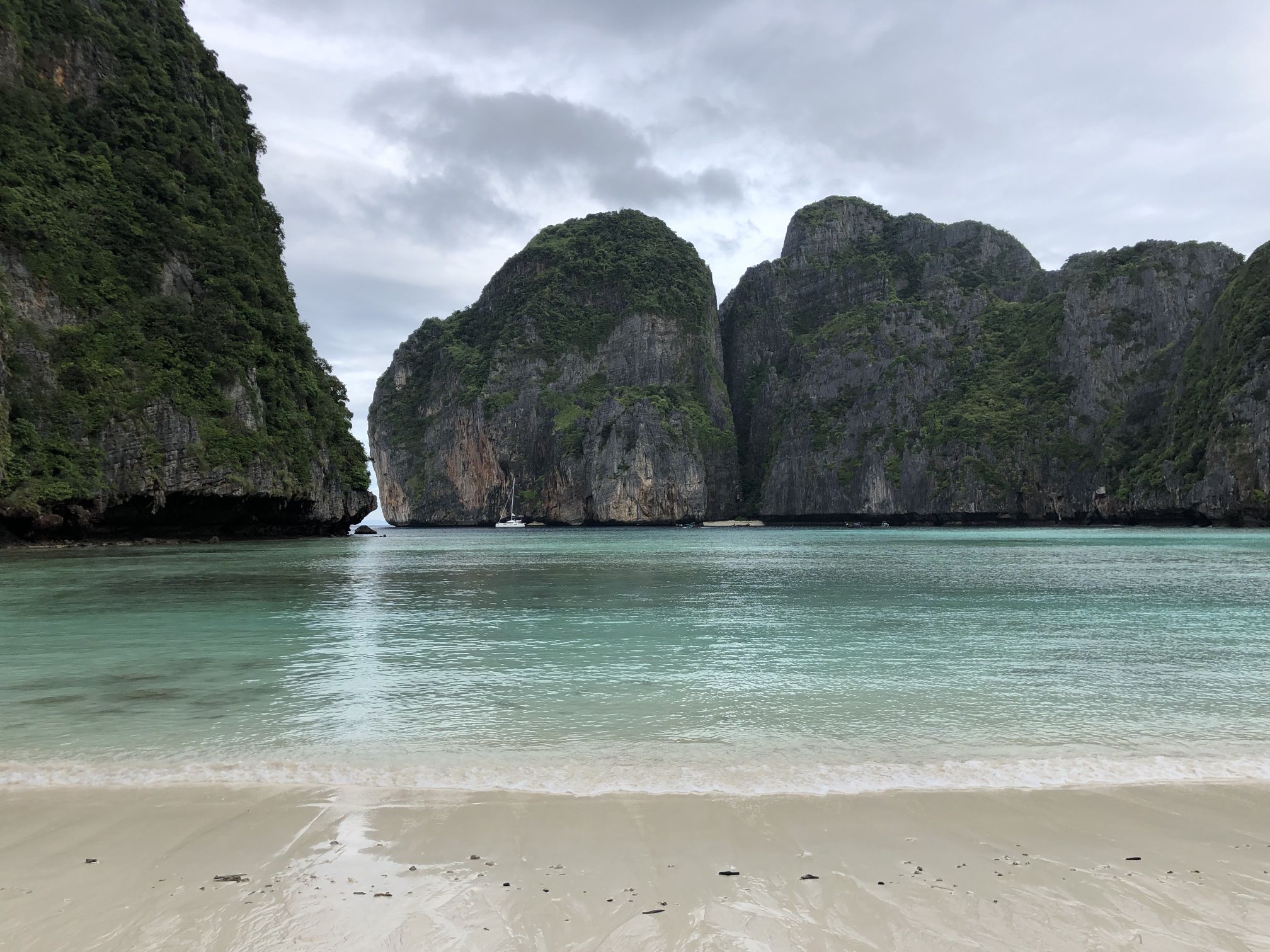 Unser Kapitän steuerte das Boot zunächst zur Filmkulissenbucht aus dem Hollywood Film “The beach”. Wir konnten schon von der Meerseite aus erkennen, dass wir nicht die ersten Landgänger waren, doch noch hielten sich die Boote, die dort ankerten in Grenzen. Noch ehe wir von Bord gingen, zahlten wir einen zusätzlichen Inseleintritt von ca. 12 Euro pro Person. Dann liefen wir über einen Holzsteg durch das dichte Grün zum Traumstrand.