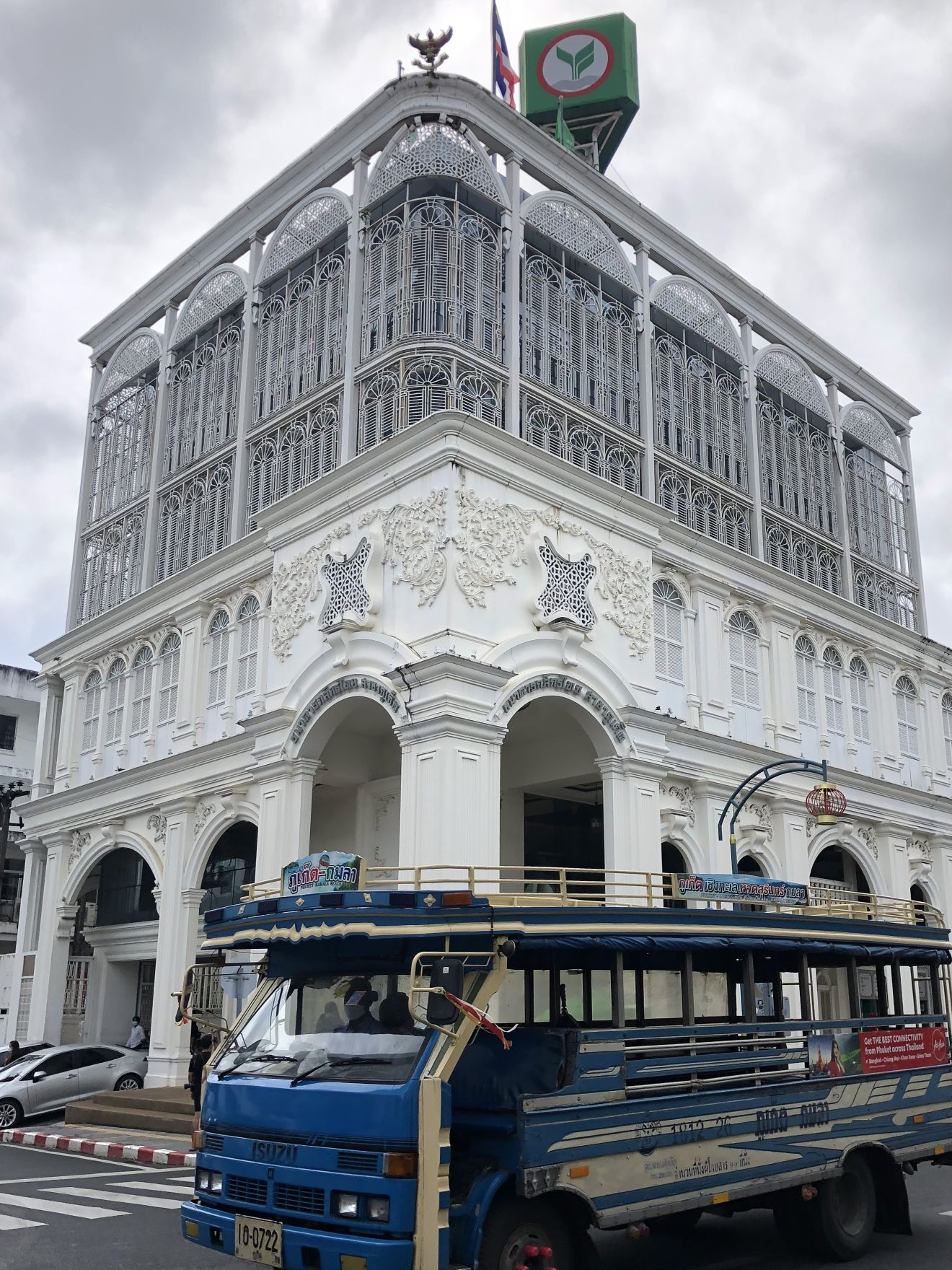 Gegen 10 Uhr legten wir dann endlich ab und erreichten gegen 11.15 Uhr das Rassada Pier in Phuket Town. Auch hier herrschte ein einziges Chaos. Koordination läuft irgendwie anders. Um in einen Minivan bzw. ein Taxi steigen zu können, musste man im voraus einen Gutschein kaufen und die Verkäuferin war hoffnungslos überfordert damit. Schließlich saßen wir eine halbe Stunde später im Minivan in die Altstadt. Unser Plan A war, bei der Touristinformation zu fragen, ob wir unsere Rucksäcke für die Zeit der Stadtbesichtigung bei ihnen deponieren könnten. Plan A ging jedoch leider nicht auf, da diese geschlossen hatte. Also trat Plan B in Kraft. In der nächst gelegenen kleinen Straßenküche fragten wir die Besitzerin, ob wir das Gepäck für ein paar Stunden bei ihr abstellen könnten und sie willigte ein. Ich drückte ihr als Dankeschön 100 Baht (2,70 Euro) in die Hand. Mit Regenschirm bewaffnet, ging es direkt in die Altstadt. Der chinesische Einfluss war unübersehbar. Schöne zweistöckige, farbige, alte Geschäftshäuser reihten sich hier aneinander.