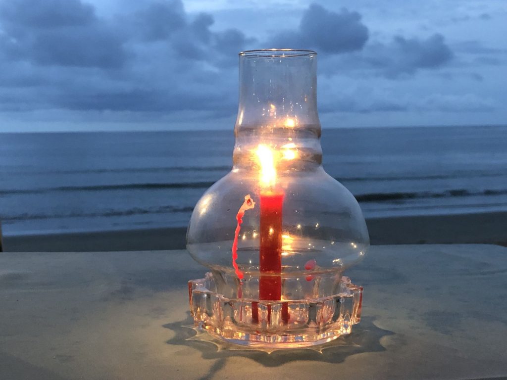 Wir fuhren daraufhin zurück zur Anlage. 75 km haben wir bei unserer Inseltour zurückgelegt. Ich hüpfte ein zweites mal in den Pool, Harald ging stattdessen an den Strand. Um 17 Uhr hatte ich noch eine ganz besondere Verabredung, nämlich mit einer Masseurin zur Thai-Massage. Wir gingen an den Strand, sie legte hübsche bunte Tücher und Handtücher auf die Liege und schon ging das Martyrium los. Zunächst bearbeitete sie meine dauerverspannten Schultern. Dann arbeitete sie sich über den Nacken und Rücken abwärts zu den Oberschenkeln und Unterschenkeln bis hin zu den Füßen. Während mir hin und wieder die Luft vor Schmerz wegblieb, witzelte mein Liebster, er hätte gar nicht gewusst, dass ich so beweglich wäre. Die Masseurin turnte auf mir herum und stemmte mir ihre Ellenbogen in alle erdenklichen Rippen. Als sie anfing meine Fussgelenke zu verbiegen und zu überdehnen fiel mir unter dem stechenden Schmerz ein, dass dies alles andere als eine gute Idee war, denn ich war gestern Abend umgeknickt und hatte mir den Knöchel vermutlich leicht verstaucht. Der Himmel über der Masseurin und mir hatte sich zwischenzeitlich mächtig verdunkelt und ein Gewitter zog auf. Als die ersten Regentropfen fielen, packten wir schnell die Matte und Tücher zusammen, ich humpelte unter Knöchelschmerzen zu unserer Hütte und wir setzten die zweite Halbzeit auf unserer Veranda fort. Abgesehen von der Knöchelbehandlung hat die Massage gut getan. Gegen 19 Uhr fuhren wir mit unserem roten Flitzer erneut zu Charlies Bar, ergatterten zwei Plätze direkt hinter der Band zum Meer hin. Direkt neben uns lagen unterschiedlichste Fleisch-Gemüse-Obstspiesse auf dem Grill und wir orderten einen Schwung. Nach und nach wurden die Krathongs zu Wasser gelassen und auch wir zündeten unsere Kerze an und ließen mein Nachmittagswerk mit lilafarbenen Orchideen davonschwimmen.